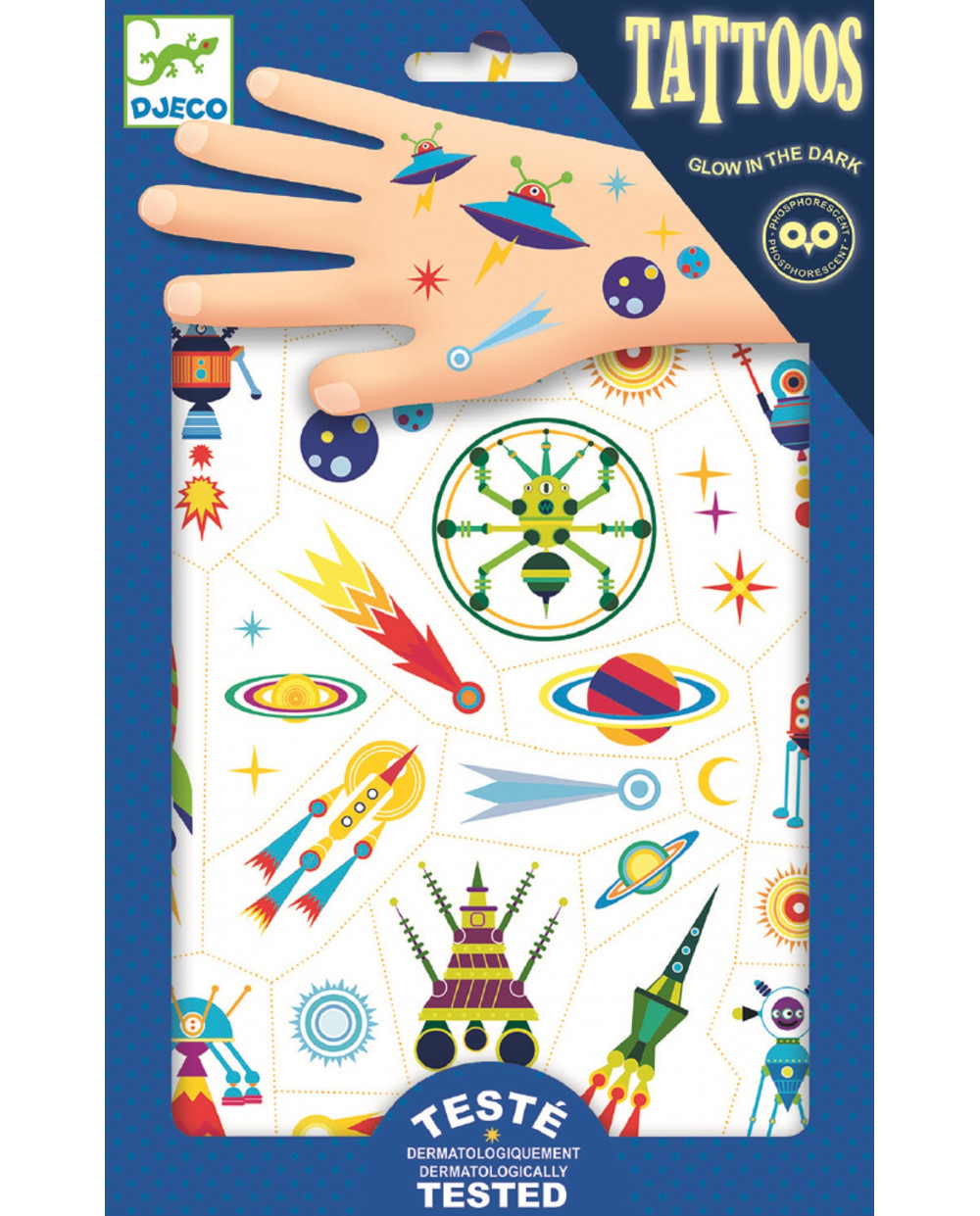 Sada DJECO Veselý vesmír obsahuje dva ilustrované archy, na kterých děti objeví pestrou galaxii veselých postaviček. Najdou zde usměvavé planetky, hvězdičky s roztomilými obličeji, vesmírné rakety i UFO s pasažéry z jiných galaxií. Každý motiv je navržen s důrazem na dětskou fantazii a estetické cítění, pro které je značka DJECO vyhlášená. S těmito tetováními se z dětí stanou opravdoví vesmírní průzkumníci.