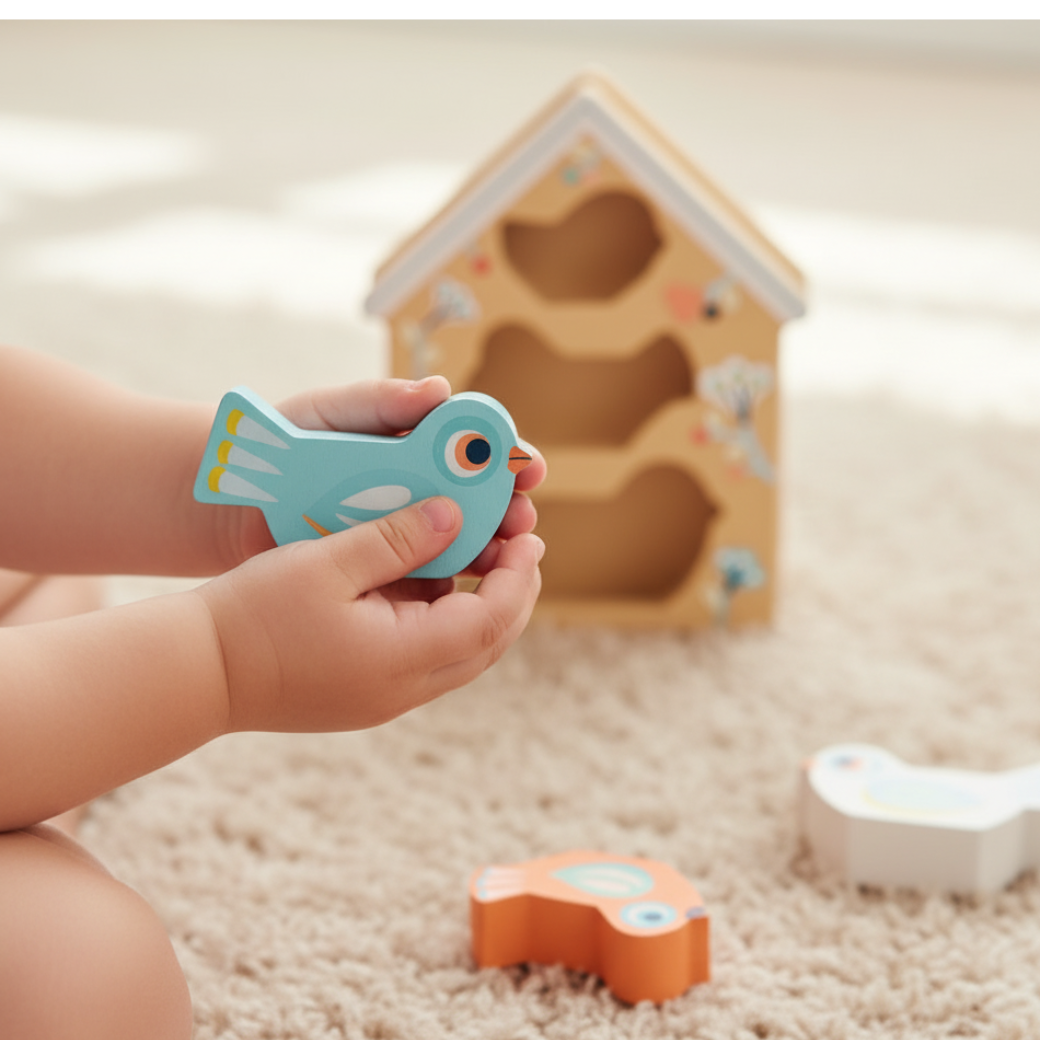Vkládací puzzle Ptačí budka je více než jen hračka. Je to vývojový pomocník, který připravuje dítě na složitější úkoly. Při pokusech o správné umístění každého ptáčka do budky si dítě procvičuje trpělivost a soustředění. Hra s ptáčky mimo budku zase podněcuje představivost a napomáhá k rozvoji vyprávění a sociálních dovedností při hře s rodiči nebo sourozenci. Tato hračka je skvělou volbou pro první seznámení s puzzle principy.