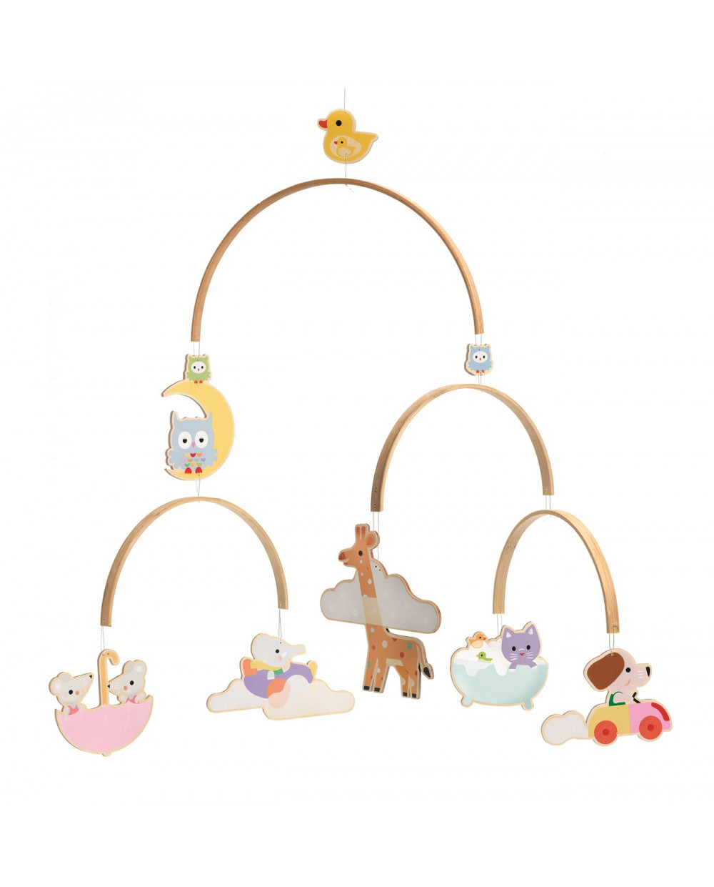 Závěs malá zvířátka v oblacích je vyroben z kvalitního, certifikovaného dřeva s důrazem na precizní provedení každého detailu. Jednotlivé prvky jsou ručně malovány nezávadnými barvami v pastelových odstínech, které jsou pro děti příjemné a lákavé.