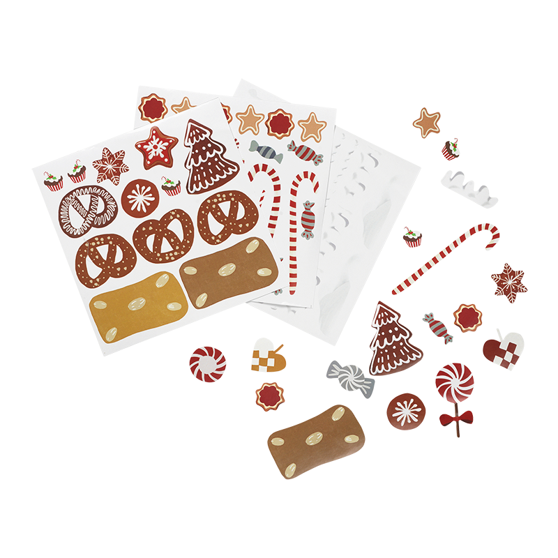 - Bohatý výběr motivů: Sada obsahuje rozmanité samolepky a washi pásky s typickými prvky z pohádky o Perníkové chaloupce. Nechybí sladké ozdůbky, sněhové vločky, zimní motivy a vše, co patří k magické atmosféře nejkouzelnějšího obydlí v lese.