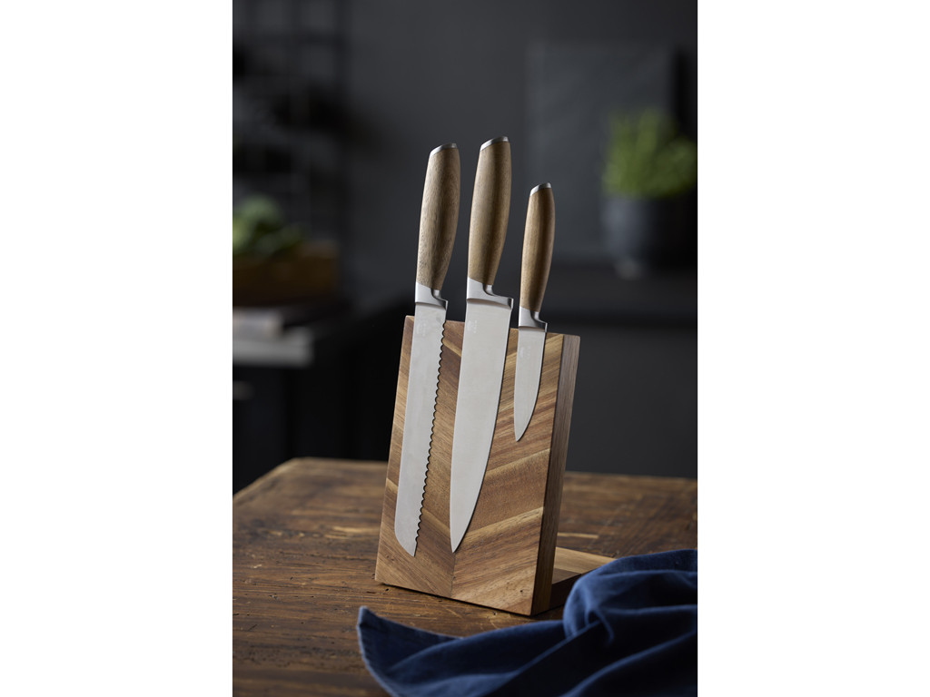 Nůž na chleba Holm 33 cm je více než jen kuchyňský nástroj; je to investice do vašeho kulinářského zážitku. Jeho robustní konstrukce a promyšlený design z něj činí spolehlivého partnera, který vám bude dělat radost po mnoho let. Kombinace chladivé elegance nerezové oceli a teplého přírodního dřeva dodá vaší kuchyni nádech skandinávské jednoduchosti a stylu.