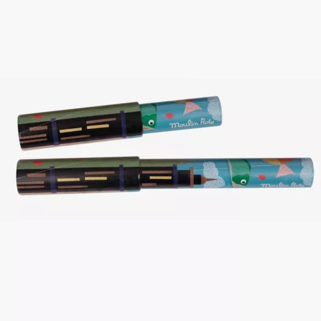 Kaleidoskop Moulin Roty – Ve dne není obyčejnou hračkou, ale propracovaným nástrojem pro rozvoj dětské představivosti. Oproti běžným kaleidoskopům nabízí unikátní systém dvojitého otáčení, který umožňuje vytvářet složitější a dynamičtější obrazce. Děti tak mohou pozorovat, jak se barevné střepy proměňují v symetrické mandaly, abstraktní květy nebo geometrické tvary. Ilustrace městské krajiny ve dne na povrchu kaleidoskopu dodává hračce příběh a podněcuje děti k vyprávění vlastních fantazijních příběhů.